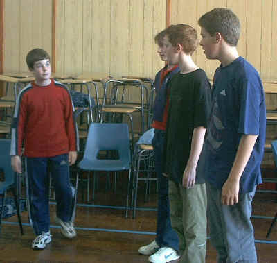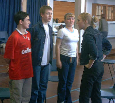 The idea with this was that by late afternoon, the Youth Theatre should be ready for some more complex improvisation. We put them in groups of four and gave them some more detailed contexts for scenes. They also had about 30s planning time. This scene was about a Sergeant who was trying to persuade his troops to undertake a (possibly fatal) mission...