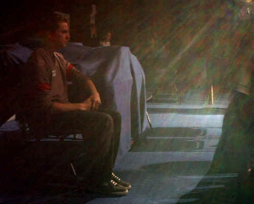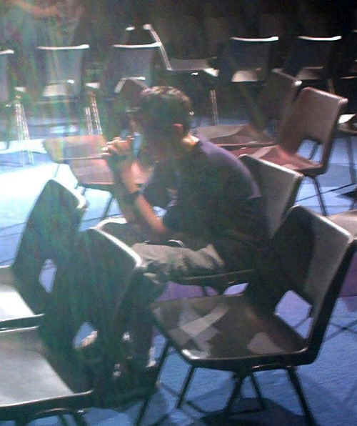 Although these aren't brilliant pictures, they do give some idea of the ambience and lighting within the "Church". There were some particularly impressive sequences involving the whole group in the body of the Church. A lot of what went on took place in shadows and half-shadows. There was a good contrast between the village-end (with normal strip lighting) and the religious end. Most people said that their Drama was improved by this use of resources.